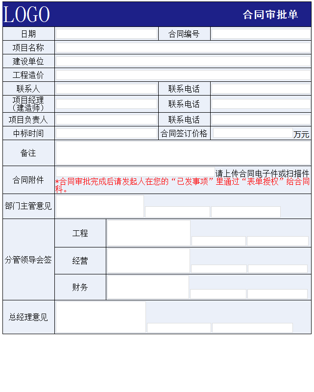 工程项目类合同审批单:该合同审批单和招投标项目审批表配套使用。