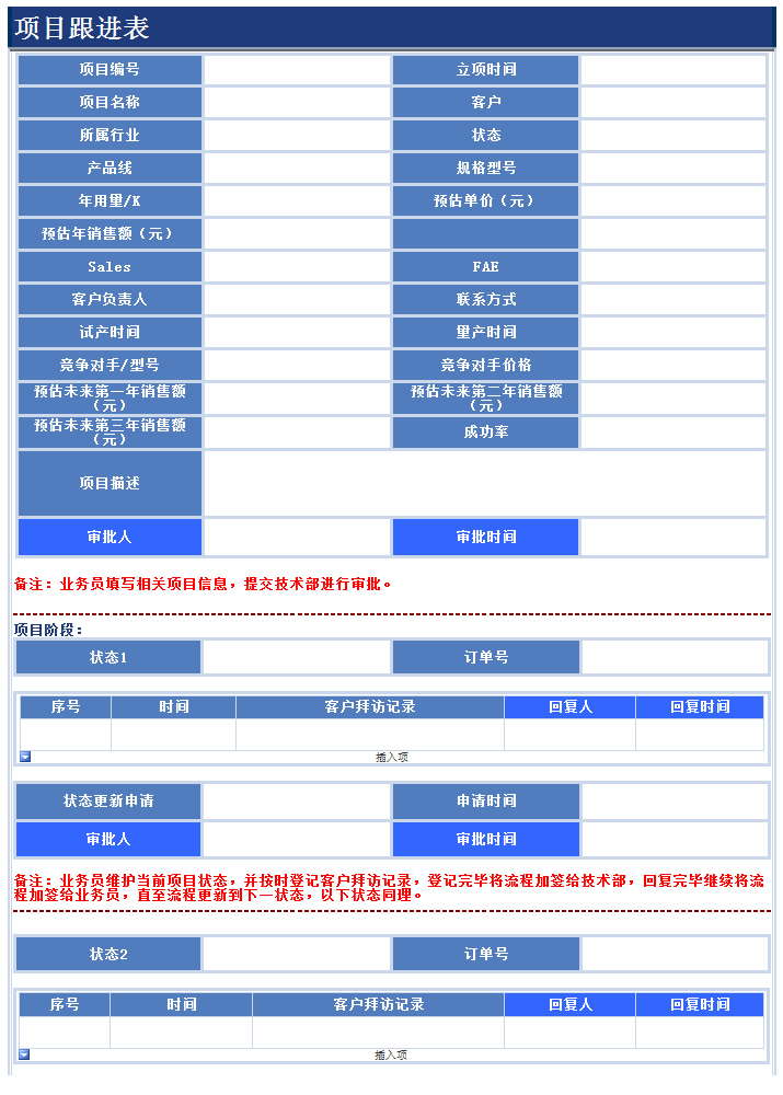 应用场景:电子行业CRM项目管理,业务员登记本人商机(项目),将商机提交给上级领导审批,审批通过后,对项目进行全程跟踪,随时更新项目状态,登记客户拜访记录。